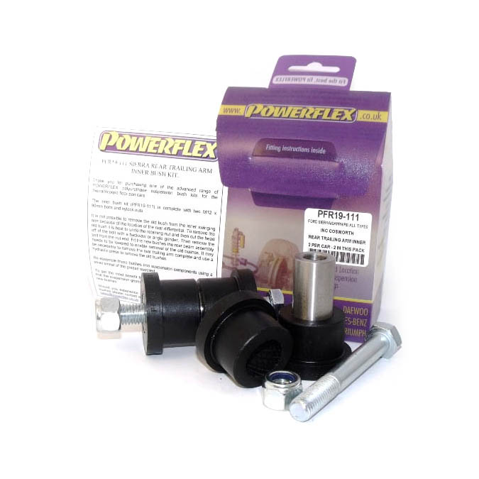 PFR19-111 - Inner bush kit is supplied with mounting bolt. Original Ford bolt needs to be cut off to be removed. Full details enclosed with fitting instructions. The inner bush kit (PFR19-111) is complete with two M12 x 90mm bolts and nylock nuts. It is not possible to remove the old bush from the inner swinging arm because of the location of the rear differential. To remove the old bush it is best to undo the retaining nut and then cut the head off of the bolt with a hacksaw or angle grinder. Then remove the bolt from the nut end. Fit the new bushes the rear beam assembly needs to be lowered to enable removal of the old bushes. It may be necessary to remove the rear trailing arm complete and use a hydraulic press to remove the old bushes. Re-assemble these bushes into suspension components using a small smear of the grease supplied. To get the most benefit from your new bushes we recommend that the suspension geometry is checked and set after fitting any new bushes.