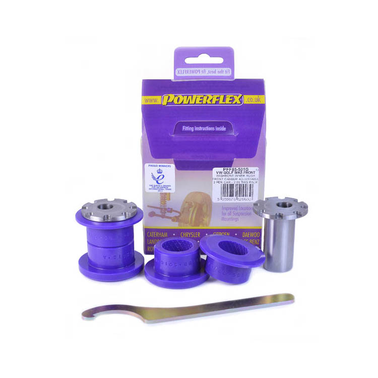 This bush features a CNC machined Stainless Steel sleeve with an offset bore that can be rotated using our bespoke tooling (supplied), giving +/- 0.5 degrees of on-car camber adjustment. It is designed to complement PFF85-502G that fits into the rear position of the same arm to provide anti-lift and caster adjust. This part replaces OE part number: 1K0407182