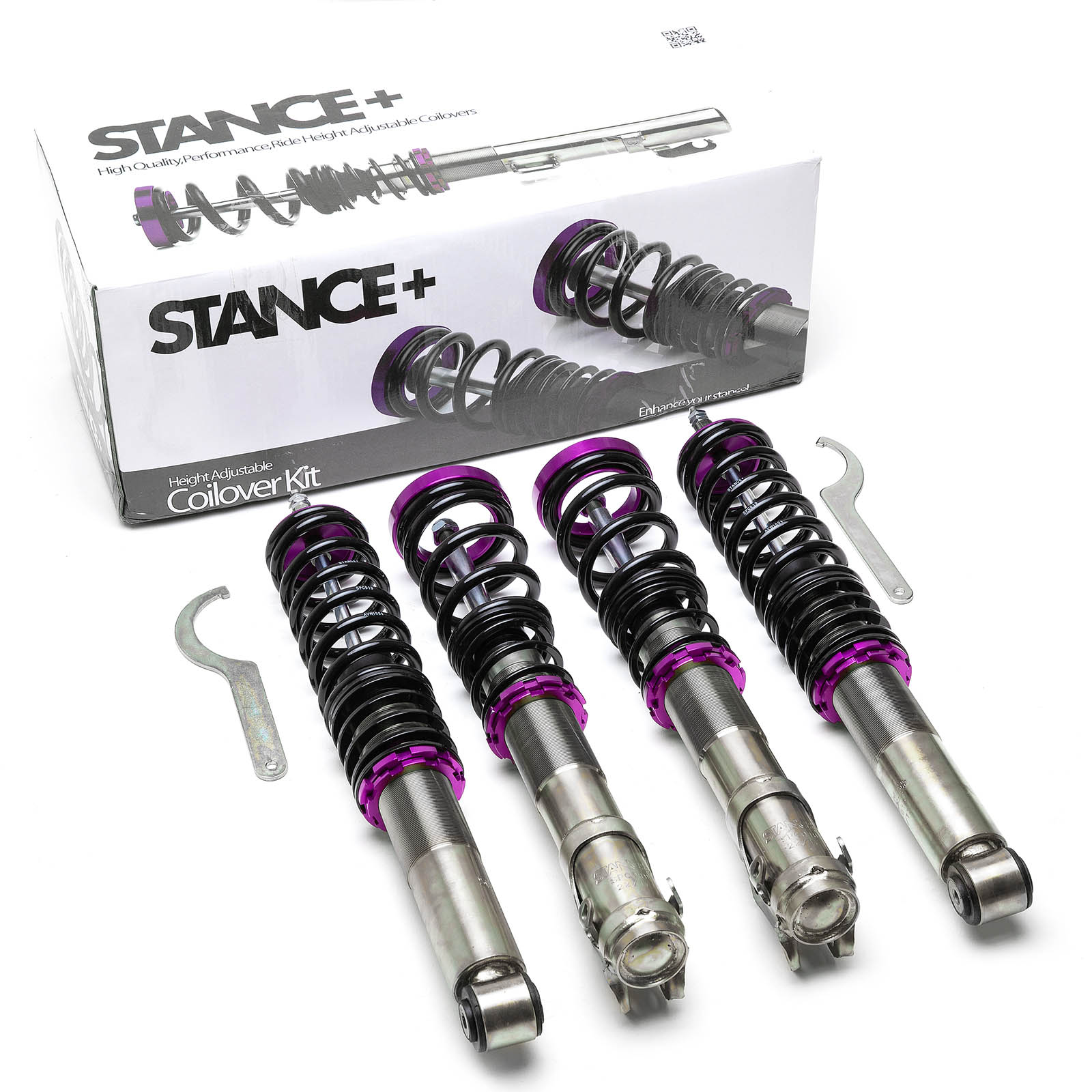 The Stance+ Ultra ride height adjustable Coilover suspension kits allow a max lowering from 30mm-90mm (most applications). The units are made from Steel and zinc plated to help weather protection. The kits are made exclusively for Stance+ and are meticulously inspected throughout the build process ensuring you get the very best quality suspension possible.